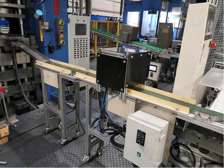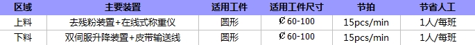 本装置可实现24H无人化自动下料。成型机推出工件,滑落到皮带输送线上,经过去残粉装置去除工件表面残粉,然后经过在线式称重仪判别是否合格,如不良则被剔除。良品则继续向后输送。