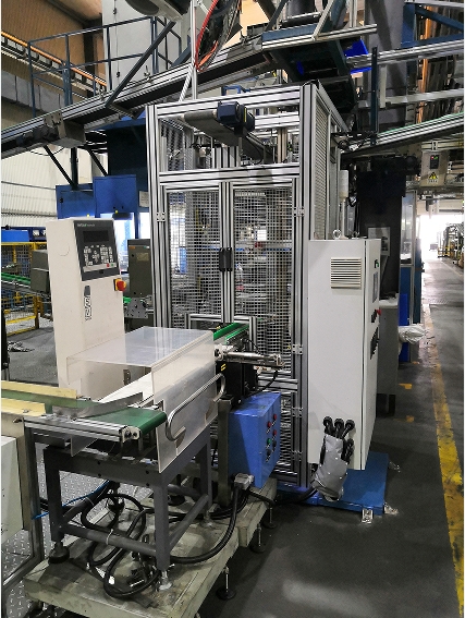通过成型机推料机构、皮带输送线、去残粉装置、在线式称重仪等机构配合使用,实现工件下料后的自动去残粉、在线式称重。