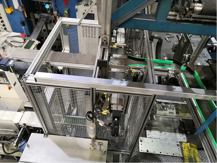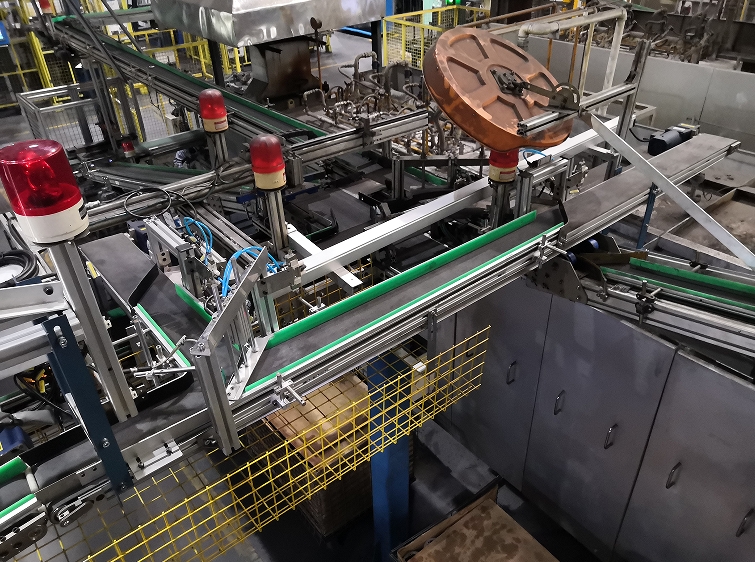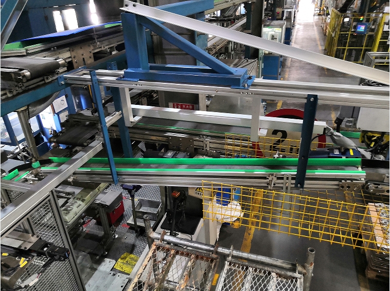 本装置可实现24H无人化自动输送。工件经过双伺服升降装置交错提升,跨过物流通道,再经过皮带输送线将工件向烧结炉入口方向输送。设备各项报警功能齐全,并设置有区域防护网。