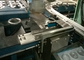 本装置可实现24H无人化自动上料。通过人工向链板积存线上投料,传感器检测到送来的工件后,气动机构把工件推入视觉检测范围。工件正上方的视觉系统对工件拍照,计算出工件需要旋转的角度以及当前位置,同时把数据发送给机器人。机器人抓取工件后,按照传输来的角度自动旋转工件,修正插入角度。同时把工件放置到整形机模具内,从而实现工件的取件、自动角度修正。如果视觉系统检测到工件放反,则该工件被自动剔除。设备各项报警功能齐全,并设置有区域防护网。