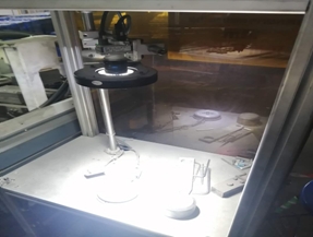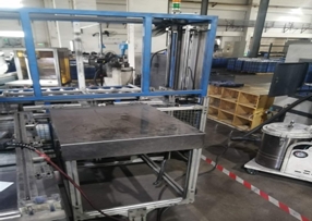 本装置可实现24H无人化自动上料。料车内的载有工件的承烧板被逐个投入辊筒输送线,被送达定位在第一套视觉系统正下方,视觉系统拍照定位工件,机器人逐个抓取后再投入到第二套视觉系统下方转台上,工件正上方的视觉系统对工件拍照,计算出工件需要旋转的角度,待转台带着工件旋转到角度后。机器人再次抓取工件,完成向钻孔设备定位夹具内的自动上料。设备各项报警功能齐全,并设置有区域防护网。